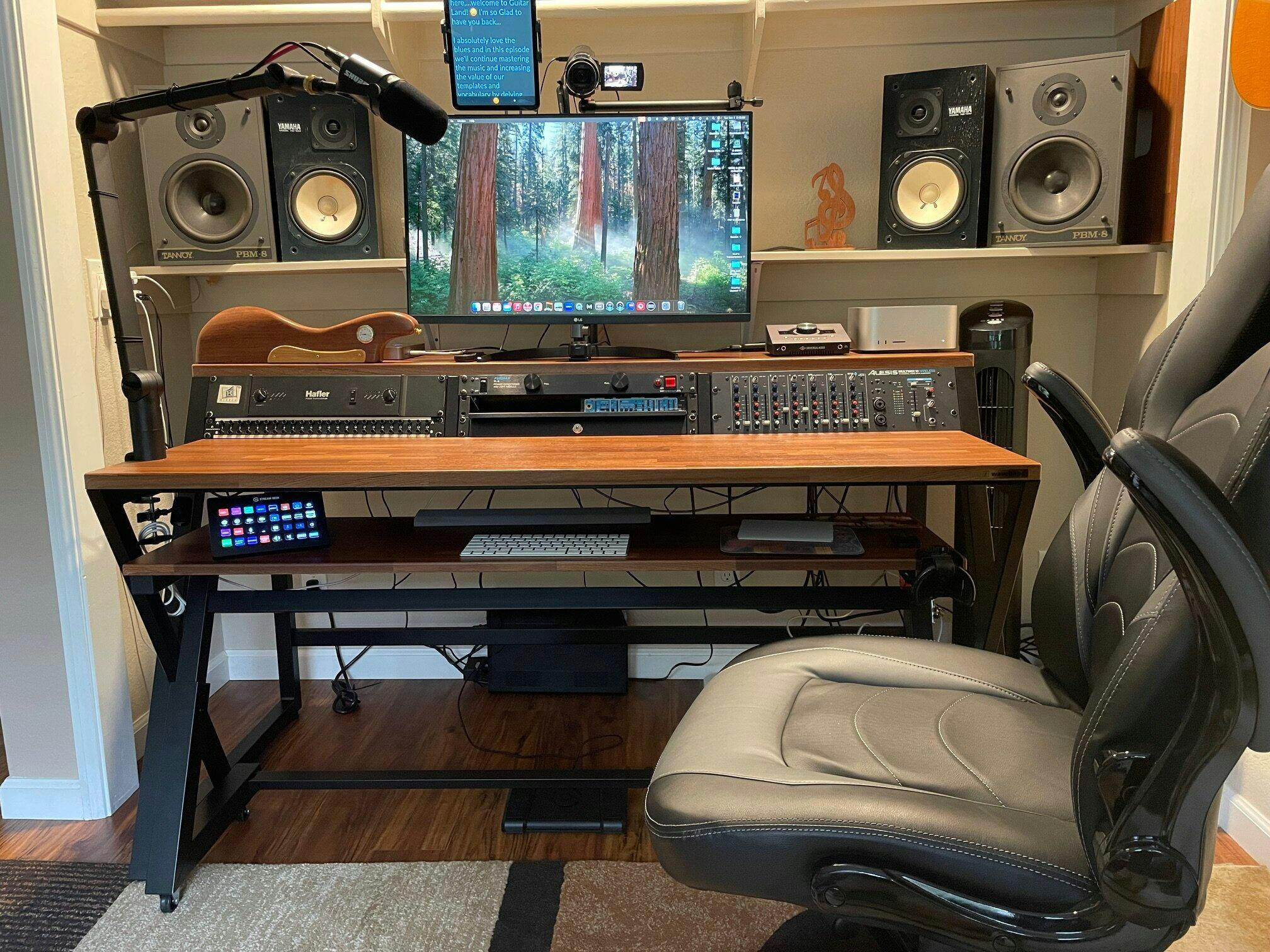 I recently updated/upgraded my studio to fit new needs. I moved from full audio studio production to multi-media digital production and needed to replace every component including my 32-track console, speakers, amplifier, large iMac, camera and lighting. After much searching online I discovered the Wavebone site and found the Headquarter desk and keyboard stand. The Headquarter desk has worked out perfectly. Assembly was easy with the help of only one other person. That is due to the solid weight of the unit, which is a strong feature. There is ample room for every new piece of gear including my earlier rack-mounted power amp and interface. Ergonomics are ideal, the footprint is much better, and the look is sensational! The walnut wood is very attractive and substantial, and has a high-quality feel. I also love the optional cable management tray accessory which really keeps cords tidy and organized. My clients are all impressed and my online video and audio work flow has greatly improved! Though there was a slight delay in delivery, the wait was worth it. Wavebone contacted me and gave me a status report.